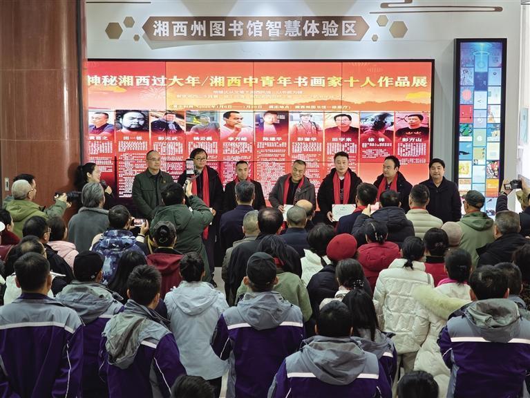 1月6日,“神秘湘西过大年”系列活动之湘西中青年画家十人展在湘西州图书馆开展。当日,前来观展的人们络绎不绝,他们轻步,凝神,目光始终聚焦于画作间那灵动的山水与淳朴的民俗,被湘西的魅力所深深吸引。