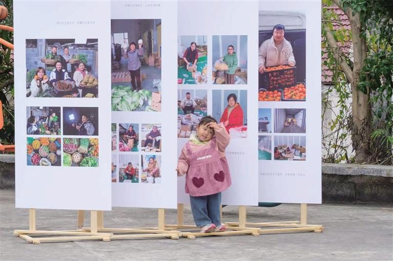 踏入东子山村,你会颠覆对“展览”的一切固有想象。这里没有白墙、没有射灯、没有警戒线,100余幅手机摄影作品如同从土地里自然生长出来——立在石头上木制的蜂箱旁,挂在晾晒辣椒的竹竿间,系在草丛间飘动的枝丫上,摊在铺晒萝卜干的球板上……一幅拍摄晨曦中东子山的作品,就悬挂在通往田埂的小路转角;那些记录村童笑靥的照片,恰好贴在孩子们追逐嬉戏的健身场边。