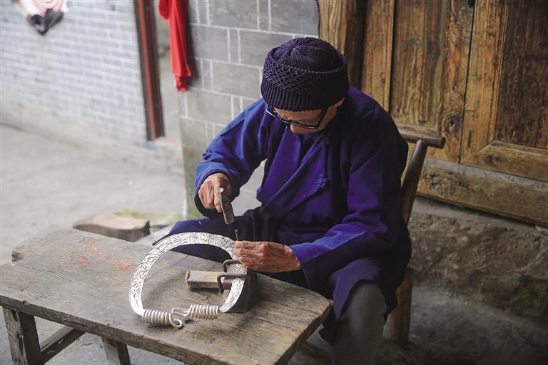在他的记忆里,自己的童年伴随着熔银的青烟与锤打的节奏。那熊熊燃烧的炭火,仿佛是银饰制作的热情火焰,旺盛而炽热。由于父亲早逝,他跟随爷爷长大。小的时候,爷爷让他蹲在风箱前拉风箱,以维持炭火温度,使得银料能够在高温的作用下迅速熔化,从固态逐渐转化为液态……赤红的银块经过熔银、炼银、拉丝、雕刻、修饰等工序,逐渐制作出凤凰展翅等各种图案的银器。这种耳濡目染的传承,让银饰技艺如同血脉般融入他的生命。如今,他即便已86岁高龄,有时还会亲自操作。