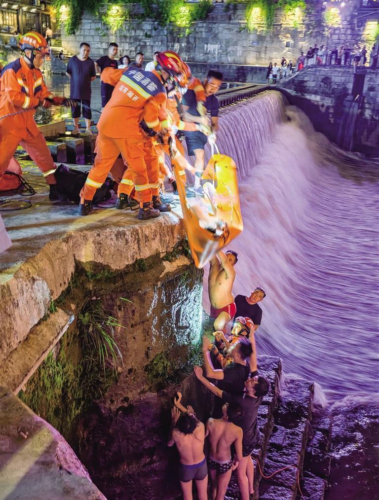 生命“托举” 2025年7月3日晚,一名青年饮酒后,从吉首市乾州古城大坝上落水受伤。救援艇划破夜色,一场跨越岸与水的生命托举上演。