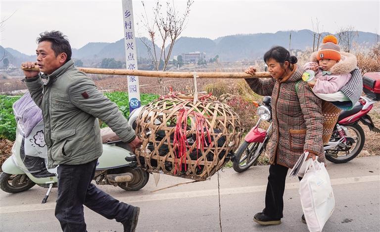 年货 2025年1月14日,花垣县龙潭镇赶集日,人们忙着置办年货。一位大姐和大哥合挑着一笼鸭子,她背上还背着个孩子,手里提着袋子。