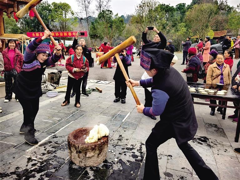 1月18日,在保靖县迁陵镇苏家坪社区,村民与游客欢聚一堂,打糍粑、杀年猪、磨豆浆,以民俗文化为纽带,助力当地文旅发展。 俞采华 摄