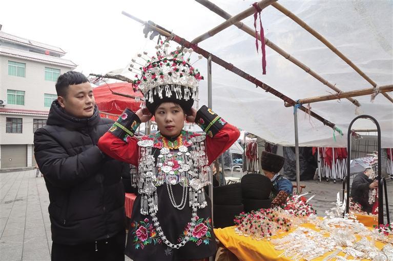 时间已接近中午,“淘江山”集市的热闹程度却丝毫不减。一个摊位上叮当作响,原来是一对新人正在挑选订婚的银饰。“好看吗?”“好看!”苗族小伙龙中兵满眼温柔地为未婚妻戴上凤冠。筹备订婚的他们,特地跑到“淘江山”来选购最纯正的苗族银饰。这样的场景,在“淘江山”集市41个非遗摊位上屡屡上演。