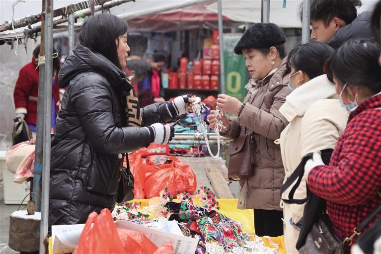 龙梅的摊位上,绣着凤鸟、蝴蝶、花卉和几何纹样的绣花包很受欢迎。“小的装零钱,中等的放手机,大的就当包用。”她拿着一个精致的小包,说起“淘江山”集市,“以前散着摆,客人找不着,现在集中了,看的人多,买的人也多了。”