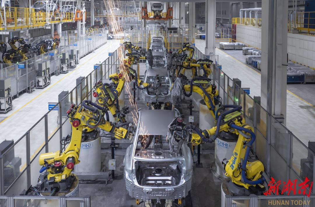 长沙比亚迪雨花基地焊装工厂,智能化生产线上的机械臂伸缩旋转,有条不紊地完成焊接工作。华声在线全媒体记者 辜鹏博 摄