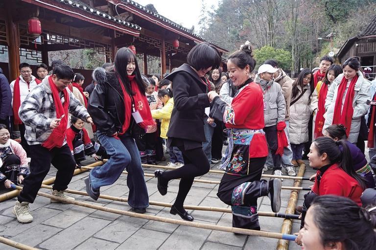 嘉宾们体验跳竹竿舞。本报全媒体记者 宿中元 摄