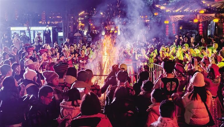 芙蓉镇的篝火晚会。本报全媒体记者 张谨 摄