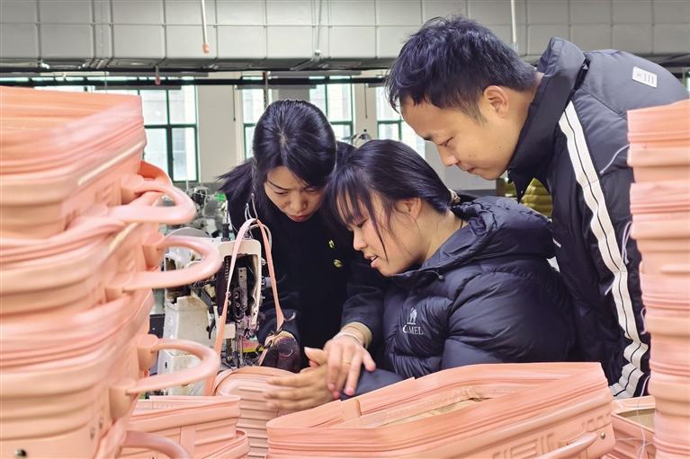 2月24日,吉首经开区箱包服饰产业园内,一名箱包企业的老员工正在指导新入职的员工学习加工技术。团结报全媒体记者 张衡 摄