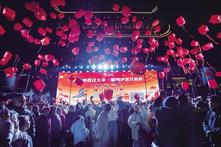 2月17日,大年初一,“福马贺岁,春满泸溪”千灯万影迎新春活动在涉江楼文化广场举行。千余盏红灯笼映照着人们对新春的美好祝愿,在《歌唱祖国》的悠扬旋律中冉冉升起,光影璀璨点亮沅水江畔十里画壁。张克宁 摄