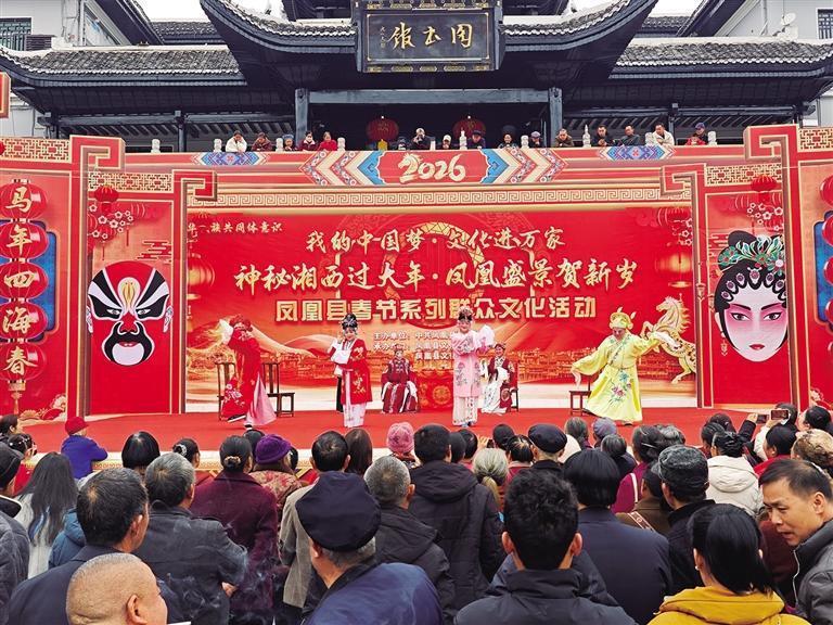 2月21日,正月初五,凤凰县从文广场,市民群众在观看传统阳戏《三女拜寿》展演,欢庆新春佳节。 滕建康 摄