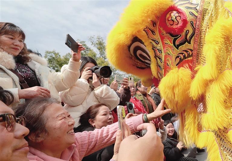 2月19日,正月初三,花垣县边城茶峒景区从文广场,游客在与“狮子”互动。春节假期,该景区举办舞龙舞狮、鱼灯巡游、鼓舞傩舞等“春到边城”系列民俗展演活动,为当地群众、外来游客献上了一场场精彩纷呈的文化盛宴。龙艾青 摄