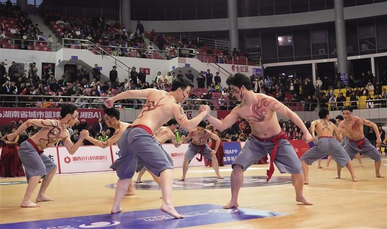 鼓声震谷,拳风破空,胸膛拍打出滚烫的节奏,傩戏的神秘、苗拳的刚猛、赤膊儿溜舞的狂热,这三样刻在湘西人血脉里的印记拧成一股绳,化作《湘西战舞》,在“湘BA”湘西赛场3月28日晚首场比赛暖场表演中惊艳亮相。