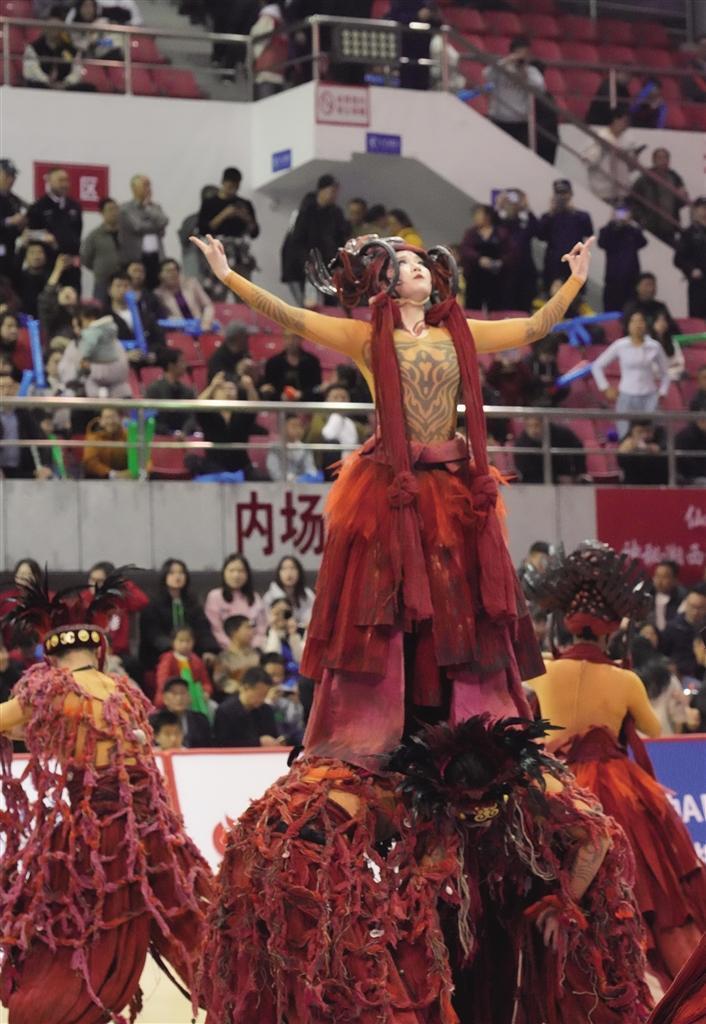 《湘西战舞》以傩戏开场。穿红衣、戴傩面、踏八卦、手掐诀,瞬间接通了先人与神灵的脉络;法鼓“咚咚”一响,直接为这场战斗定下庄严基调——这从来不是比赛的普通序幕,而是湖湘血性的彻底觉醒,是家国强盛的虔诚祈愿。此刻,篮球场上的傩戏,早已不是深山祭祀里遥远的神明化身,而是站在聚光灯下、与球员并肩作战的守护者。