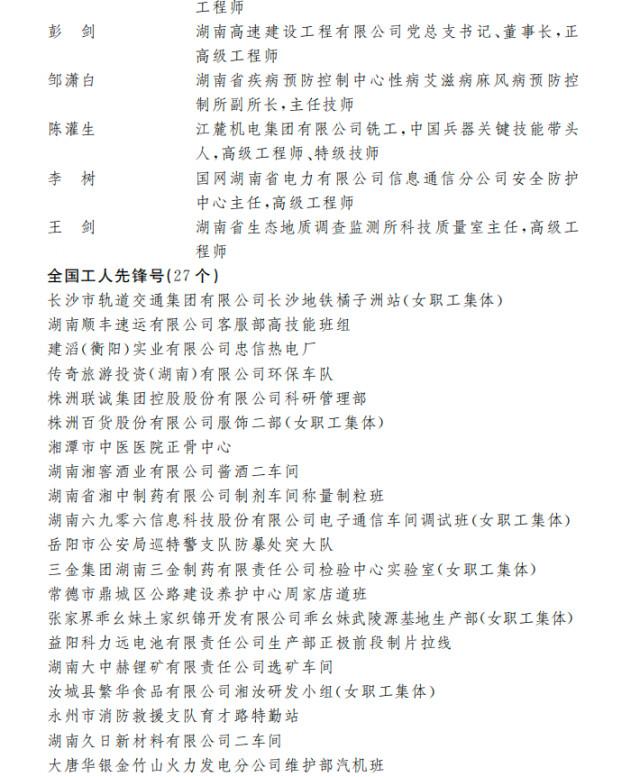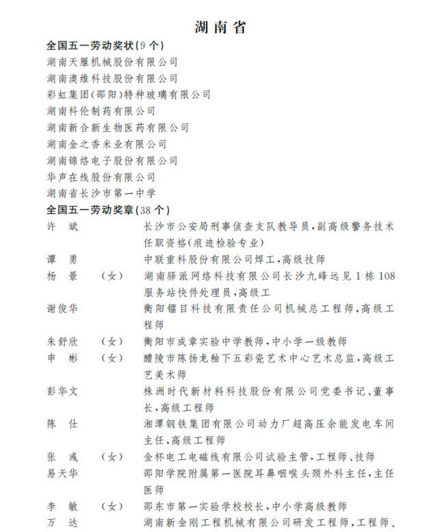 经过层层审核,湖南省有华声在线股份有限公司等9家单位荣获全国五一劳动奖状称号,来自长沙市公安局刑事侦查支队的许斌等38名个人荣获全国五一劳动奖章称号,长沙市轨道交通集团有限公司长沙地铁橘子洲站(女职工集体)等27个集体荣获全国工人先锋号称号。