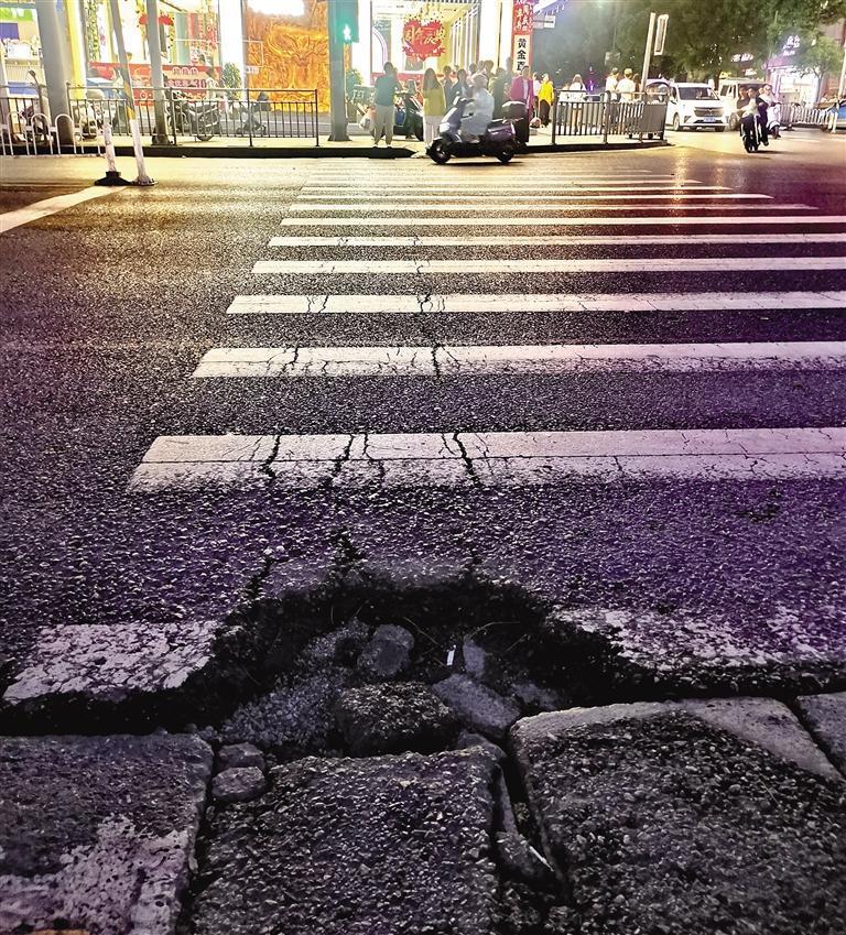 图为花垣县城建设中路与赶秋路交会的十字路口,人行道斑马线路面出现一个大坑洞,行人经过时很容易被绊倒或崴脚。