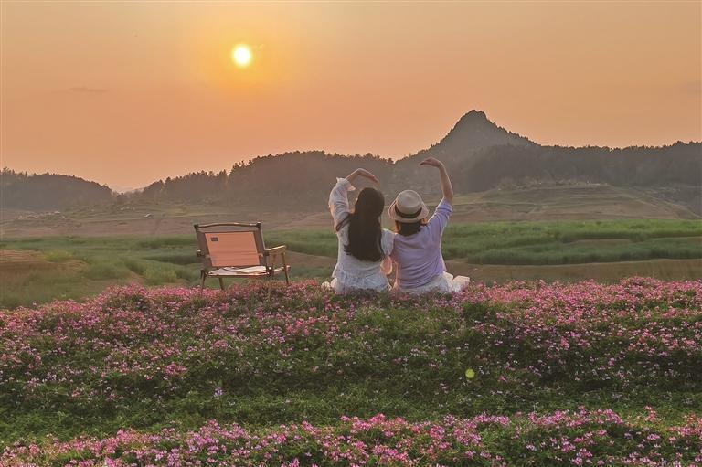 近日,在花垣县花垣镇夯渡村附近的紫霞湖边,成片的紫云英竞相绽放,美不胜收,吸引了不少游人前来赏花游玩、拍照打卡。夕阳西下,紫色花海与落日红霞相映成趣,游人陶醉其中,迟迟不舍归去。 团结报全媒体记者 张衡 摄