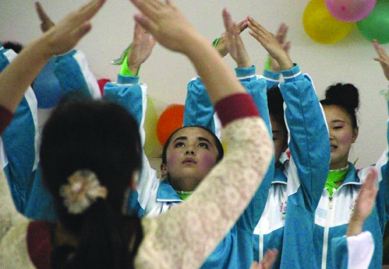 ▲ 5月30日,龙山县特殊教育学校,聋哑孩子在老师的带领下表演节目,欢庆“六一”儿童节。 刘 怡 摄