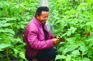4月24日,永顺县吊井乡吊井村“春明蔬菜专业合作社”社员彭武明正在查看西红柿长势。今年,彭武明种植的8000多株“红孩儿”西红柿,花繁果硕,丰收在望。近年来,该县在推进农业产业结构调整过程中,大力引导农民种植绿色无污染蔬菜,采取项目扶持,规模化、标准化、品牌化、市场化建设,积极打造“一村一品”、“农超对接”高效特色种植业,推动蔬菜产业向园区化、规模化、产业化发展。 吴 华 摄