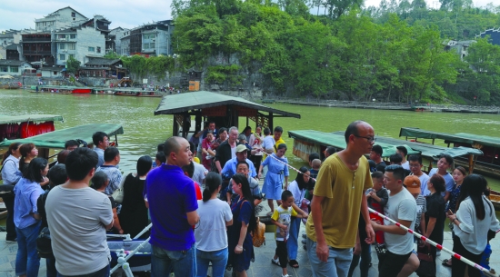 10月2日,花垣县边城景区古码头,前来休闲观光的游客络绎不绝。当天,该景区接待来自全国各地的游5000多人,掀起国庆长假旅游小高潮。 龙艾青 摄