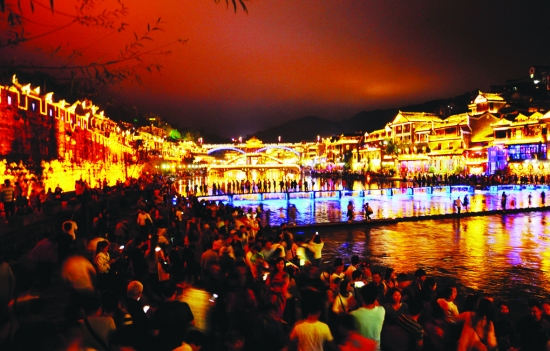 ▲ 10月2日晚,游客在凤凰古城沱江河畔观赏璀璨的夜景。当天是国庆中秋假第二天,凤凰古城核心景区迎来旅游高峰,古城内大街小巷、沱江河畔各景点游客接踵摩肩,旅游场面火爆。 滕建康 摄