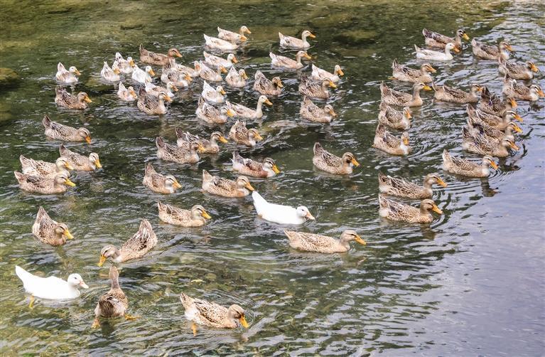 苦竹河清澈见底,鸭子在其中嬉戏捕鱼,当真可以看见“红掌拨清波”。 团结报见习记者 胡承鼎 摄