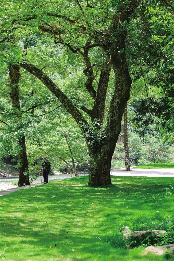 刚进汝池社区,目光便被两棵参天大树所吸引,走近一看,原是两棵麻柳树,一棵约190岁,一棵约240岁,树木苍劲、树冠横斜,遮天覆日。几个村民在树荫庇护下的凉亭里安然酣睡。