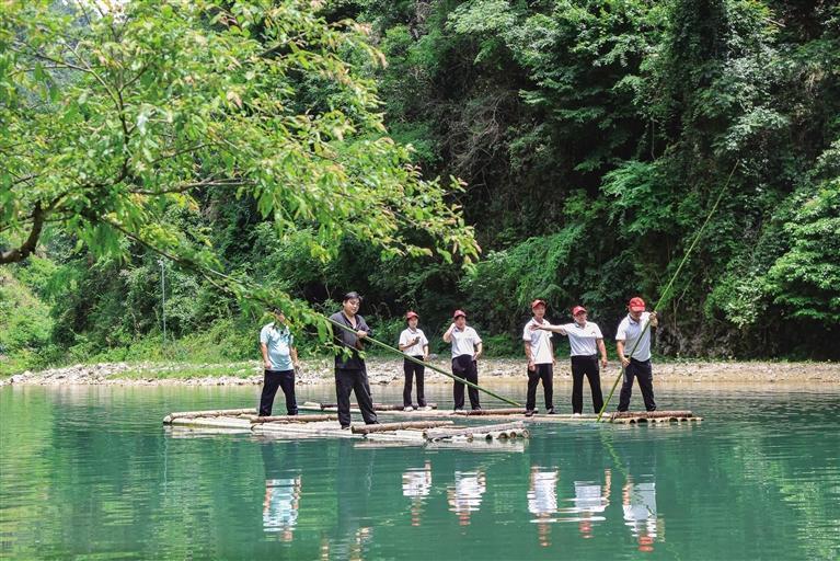 游人踩着竹排,撑着竹篙,融入山水画卷之中。 团结报见习记者 胡承鼎 摄