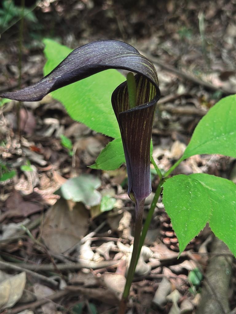 灯台莲在石林稀薄的土壤里悄然生长,高十余厘米,叶片边缘锯齿,但翠绿柔软,随山风摇曳。四月,灯台莲含苞待放。它的花苞仅一片单瓣,不规则,生长着暗紫与淡绿相间的条纹,以漏斗状包裹着花蕊。可以想象,待它盛放时,花瓣张开似佛焰,花蕊袒露似灯台。